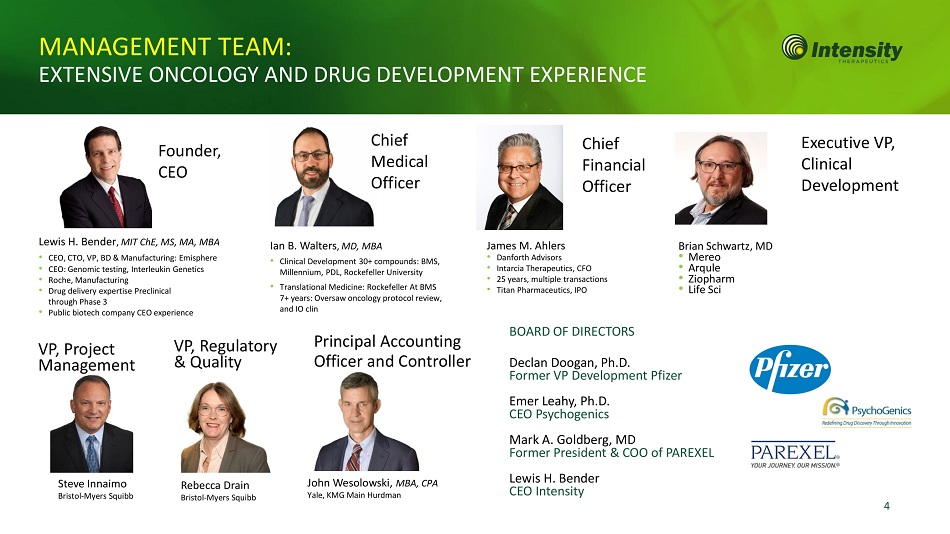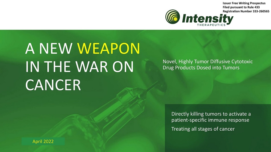 Intensity Therapeutics, Inc. (the “Company” or “we”) has filed a registration statement, including a preliminary prospectus, with the U.S. Securities and Exchange Commission (the “SEC”) (File No. 333 - 260565) in connection with the offering to which this presentation relates. Sales of the securities of the Company offered pursuant to the registration statement may not be made or offers for such securities accepted prior to the registration statement becoming effective. Before you invest, you should read the registration statement, the preliminary prospectus included within the registration statement and other documents the Company has filed with the SEC for more complete information about the Company and this offering. You can obtain a copy of the preliminary prospectus for free by visiting EDGAR on the SEC website at www.sec.gov. Alternatively, the Company will arrange to send you the preliminary prospectus, which you may request by emailing jwesolowski@intensitytherapeutics.com. This presentation may not be reproduced, forwarded to any person or published, in whole or in part. The Company is not soliciting offers to buy securities of the Company in any jurisdiction where the offer or sale is not permitted. This presentation contains forward - looking statements within the meaning of The Private Securities Litigation Reform Act of 1995 that involve substantial risks and uncertainties, including statements regarding the development and regulatory status of our product candidates, such as statements with respect to our lead product candidate INT230 - 6, and the timing of clinical trials and data from those trials for our product candidates, and our discovery programs that may lead to our development of additional product candidates, the potential utility of our technology and therapeutic potential of our product candidates, the potential commercialization of any of our product candidates, and the sufficiency of our cash resources. All statements, other than statements of historical facts, contained in this presentation, including statements regarding our strategy, future operations, future financial position, future revenues, projected costs, prospects, plans and objectives of management, are forward - looking statements. The words “anticipate,” “believe,” “estimate,” “expect,” “intend,” “may,” “might,” “plan,” “predict,” “project,” “target,” “potential,” “will,” “would,” “could,” “should,” “continue,” and similar expressions are intended to identify forward - looking statements, although not all forward - looking statements contain these identifying words. We may not actually achieve the plans, intentions or expectations disclosed in our forward - looking statements, and you should not place undue reliance on our forward - looking statements. Actual results or events could differ materially from the plans, intentions and expectations disclosed in the forward - looking statements we make as a result of various risks and uncertainties, including but not limited to: whether we will be able to successfully conduct Phase 1, 2 or 3 clinical trials for INT230 - 6, whether we complete other clinical trials for our product candidates, whether we receive results from our clinical trials on our expected timelines, or at all, whether our cash resources will be sufficient to fund our foreseeable and unforeseeable operating expenses and capital expenditure requirements on our expected timeline, whether the COVID - 19 pandemic impacts our operations, and other factors included in the “Risk Factors” section of the Company’s filings with the SEC in the future. Any of these outcomes could cause our actual results to differ from those contained in the forward - looking statements of the Company’s filings with the SEC. The forward - looking statements contained in this presentation reflect our current views as of the date of this presentation with respect to future events, and we assume no obligation to update any forward - looking statements except as required by applicable law. The Intensity Therapeutics, Inc. name and logo are our trademarks. We also own the service mark and the registered U.S. trademark for DfuseRx. The trademarks, trade names and service marks appearing in this presentation are the property of the Company. We have omitted the ® and Ρ designations, as applicable, for the trademarks named in 2 this presentation. SAFE HARBOR AND FORWARD - LOOKING STATEMENTS