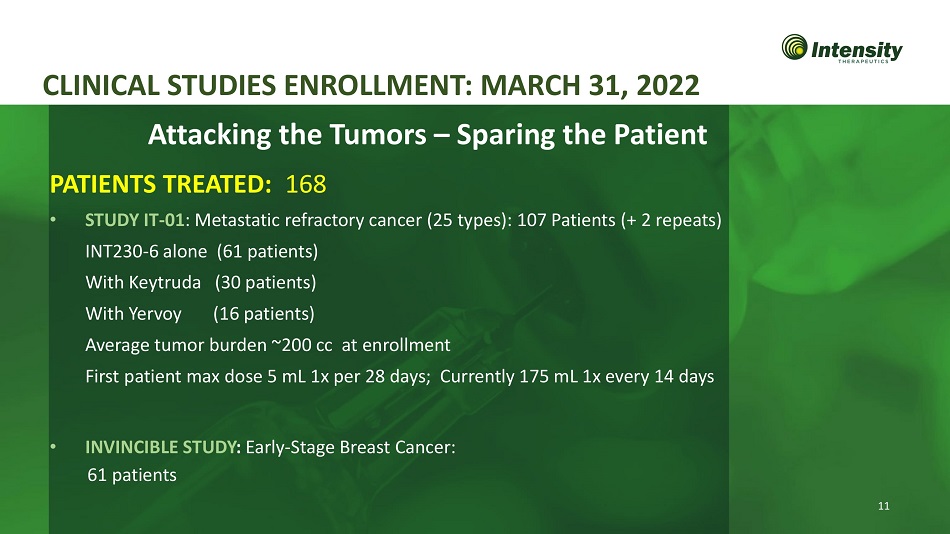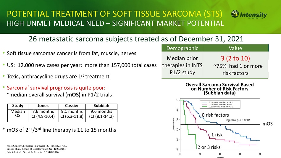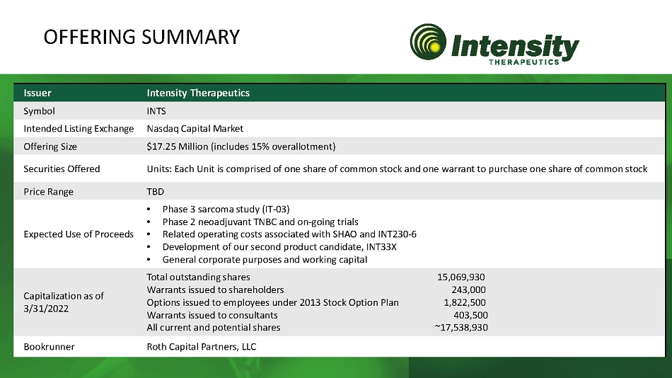 Issuer Intensity Therapeutics Symbol INTS Intended Listing Exchange Nasdaq Capital Market Offering Size $17.25 Million (includes 15% overallotment) Securities Offered Units comprised of one share of common stock and one warrant to purchase one share of common stock Price Range TBD Expected Use of Proceeds • Phase 3 sarcoma study (IT - 03) • Phase 2 neoadjuvant TNBC and on - going trials • Related operating costs associated with SHAO and INT230 - 6 • Development of our second product candidate, INT33X • General corporate purposes and working capital Capitalization as of 3/31/2022 Total outstanding shares 15 , 069 , 930 Warrants issued to shareholders 243 , 000 Options issued to employees under 2013 Stock Option Plan 1 , 822 , 500 Warrants issued to consultants 403 , 500 All current and potential shares ~ 17 , 538 , 930 Bookrunner Roth Capital Partners, LLC OFFERING SUMMARY