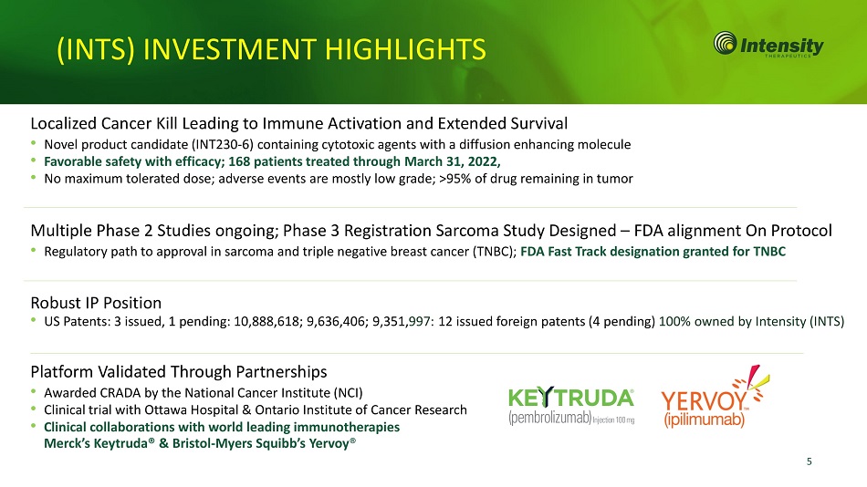 4 MANAGEMENT TEAM: EXTENSIVE ONCOLOGY AND DRUG DEVELOPMENT EXPERIENCE Lewis H. Bender , MIT ChE, MS, MA, MBA • CEO, CTO, VP, BD & Manufacturing: Emisphere • CEO: Genomic testing, Interleukin Genetics • Roche, Manufacturing • Drug delivery expertise Preclinical through Phase 3 • Public biotech company CEO experience Ian B. Walters , MD, MBA • Clinical Development 30+ compounds: BMS, Millennium, PDL, Rockefeller University • Translational Medicine: Rockefeller At BMS 7+ years: Oversaw oncology protocol review, and IO clin James M. Ahlers • Danforth Advisors • Intarcia Therapeutics, CFO • 25 years, multiple transactions • Titan Pharmaceutics, IPO Steve Innaimo Bristol - Myers Squibb Rebecca Drain Bristol - Myers Squibb John Wesolowski, MBA, CPA Yale, KMG Main Hurdman BOARD OF DIRECTORS Declan Doogan, Ph.D. Former VP Development Pfizer Emer Leahy, Ph.D. CEO Psychogenics Mark A. Goldberg, MD Former President & COO of PAREXEL Lewis H. Bender CEO Intensity Founder, CEO Chief Medical Officer Principal Accounting Officer and Controller Chief Financial Officer VP, Regulatory & Quality VP, Project Management Executive VP, Clinical Development Brian Schwartz, MD • Mereo • Arqule • Ziopharm • Life Sci