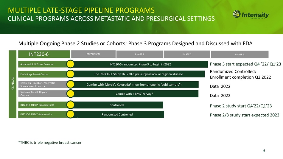 Localized Cancer Kill Leading to Immune Activation and Extended Survival • Novel product candidate (INT230 - 6) containing cytotoxic agents with a diffusion enhancing molecule • Favorable safety with efficacy; 168 patients treated through March 31, 2022, • No maximum tolerated dose; adverse events are mostly low grade; >95% of drug remaining in tumor Multiple Phase 2 Studies ongoing; Phase 3 Registration Sarcoma Study Designed – FDA alignment On Protocol • Regulatory path to approval in sarcoma and triple negative breast cancer (TNBC); FDA Fast Track designation granted for TNBC Robust IP Position • US Patents: 3 issued, 1 pending: 10,888,618; 9,636,406; 9,351, 997: 12 issued foreign patents (4 pending) 100% owned by Intensity (INTS) Platform Validated Through Partnerships • Awarded CRADA by the National Cancer Institute (NCI) • Clinical trial with Ottawa Hospital & Ontario Institute of Cancer Research • Clinical collaborations with world leading immunotherapies Merck’s Keytruda® & Bristol - Myers Squibb’s Yervoy ® 5 (INTS) INVESTMENT HIGHLIGHTS
