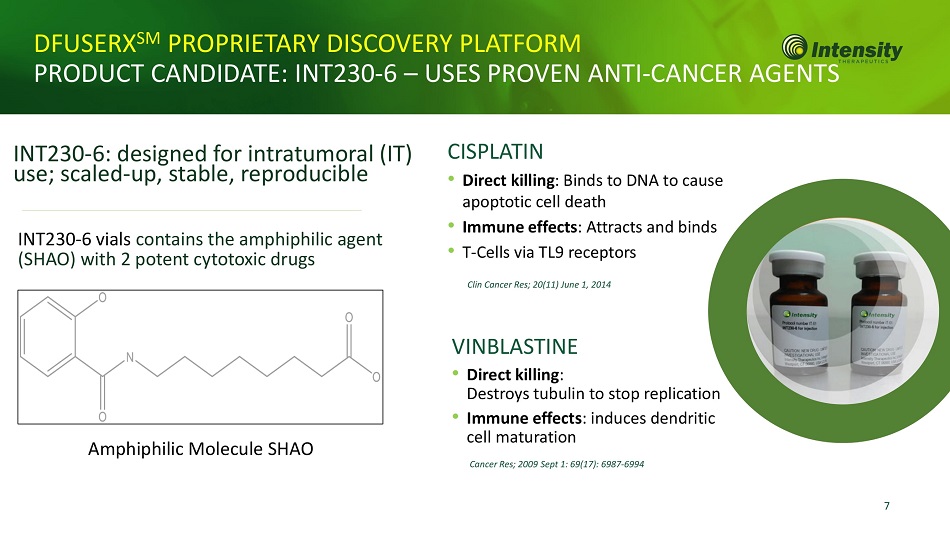 7 DFUSERX SM PROPRIETARY DISCOVERY PLATFORM PRODUCT CANDIDATE: INT230 - 6 – USES PROVEN ANTI - CANCER AGENTS INT230 - 6: designed for intratumoral (IT) use; scaled - up, stable, reproducible INT230 - 6 vials contains the amphiphilic agent (SHAO) with 2 potent cytotoxic drugs Amphiphilic Molecule SHAO CISPLATIN • Direct killing : Binds to DNA to cause apoptotic cell death • Immune effects : Attracts and binds • T - Cells via TL9 receptors Clin Cancer Res; 20(11) June 1, 2014 VINBLASTINE • Direct killing : Destroys tubulin to stop replication • Immune effects : induces dendritic cell maturation Cancer Res; 2009 Sept 1: 69(17): 6987 - 6994