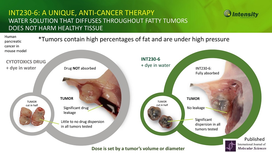 8 INT230 - 6: A UNIQUE, ANTI - CANCER THERAPY WATER SOLUTION THAT DIFFUSES THROUGHOUT FATTY TUMORS DOES NOT HARM HEALTHY TISSUE *Tumors contain high percentages of fat and are under high pressure CYTOTOXICS DRUG + dye in water Little to no drug dispersion in all tumors tested TUMOR cut in half Significant drug leakage Drug NOT absorbed Human pancreatic cancer in mouse model TUMOR cut in half Significant dispersion in all tumors tested No leakage INT230 - 6: Fully absorbed INT230 - 6 + dye in water Dose is set by a tumor’s volume or diameter TUMOR TUMOR Published