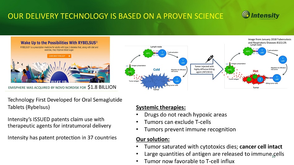 OUR DELIVERY TECHNOLOGY IS BASED ON A PROVEN SCIENCE Technology First Developed for Oral Semaglutide Tablets (Rybelsus) Intensity’s ISSUED patents claim use with therapeutic agents for intratumoral delivery Intensity has patent protection in 37 countries EMISPHERE WAS ACQUIRED BY NOVO NORDISK FOR $1.8 BILLION Systemic therapies: • Drugs do not reach hypoxic areas • Tumors can exclude T - cells • Tumors prevent immune recognition Our solution: • Tumor saturated with cytotoxics dies; cancer cell intact • Large quantities of antigen are released to i m m un e 1 c 0 ells • Tumor now favorable to T - cell influx Image from January 2018 Tuberculosis and Respiratory Diseases 81(1):29.