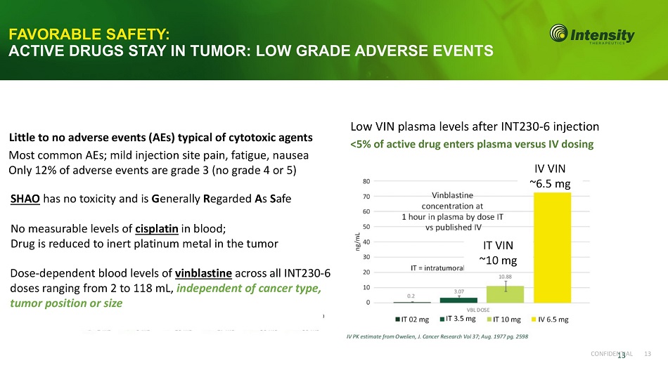 C ON F I D E N 1 T 3 I A L 13 FAVORABLE SAFETY: ACTIVE DRUGS STAY IN TUMOR: LOW GRADE ADVERSE EVENTS IV VIN ~6.5 mg Dose - dependent blood levels of vinblastine across all INT230 - 6 doses ranging from 2 to 118 mL, independent of cancer type, tumor position or size SHAO has no toxicity and is G enerally R egarded A s S afe No measurable levels of cisplatin in blood; Drug is reduced to inert platinum metal in the tumor Low VIN plasma levels after INT230 - 6 injection <5% of active drug enters plasma versus IV dosing IT VIN ~10 mg Little to no adverse events (AEs) typical of cytotoxic agents Most common AEs; mild injection site pain, fatigue, nausea Only 12% of adverse events are grade 3 (no grade 4 or 5)