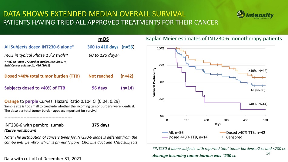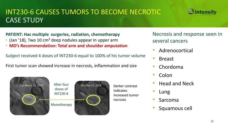 *INT230 - 6 alone subjects with reported total tumor burdens >2 cc and <700 cc. 14 0% 25% 50% 75% 100% 0 100 200 300 400 500 Survival Probability Days All, n=56 Dosed <40% TTB, n=14 Dosed >40% TTB, n=42 Censored <40% (N=14) DATA SHOWS EXTENDED MEDIAN OVERALL SURVIVAL PATIENTS HAVING TRIED ALL APPROVED TREATMENTS FOR THEIR CANCER Kaplan Meier estimates of INT230 - 6 monotherapy patients Data with cut - off of December 31, 2021 mOS 360 to 410 days (n=56 ) 90 to 120 days^ All Subjects dosed INT230 - 6 alone* mOS in typical Phase 1 / 2 trials^ ^ Ref. on Phase 1/2 basket studies, see Chau, N., BMC Cancer volume 11, 426 (2011) Dosed >40% total tumor burden (TTB) Not reached (n=42) Subjects dosed to <40% of TTB 96 days (n=14) Orange to purple Curves: Hazard Ratio 0.104 CI (0.04, 0.29) Sample size is too small to conclude whether the incoming tumor burdens were identical. The dose per total tumor burden appears important for survival --------- - - - -- - -- - - - -- - -- - -- - - - -- - -- - - - -- - -- - - INT230 - 6 with pembrolizumab 375 days (Curve not shown) Note: The distribution of cancers types for INY230 - 6 alone is different from the combo with pembro, which is primarily panc, CRC, bile duct and TNBC subjects Average incoming tumor burden was ~200 cc >40% (N=42) All (N=56)