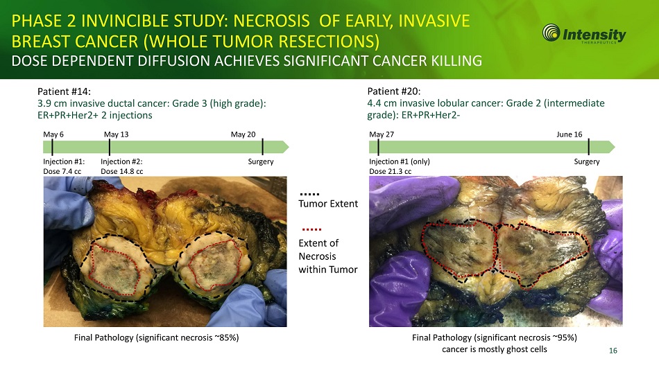 15 INT230 - 6 CAUSES TUMORS TO BECOME NECROTIC CASE STUDY PATIENT: Has multiple surgeries, radiation, chemotherapy • (Jan ’18), Two 10 cm 3 deep nodules appear in upper arm • MD’s Recommendation: Total arm and shoulder amputation Subject received 4 doses of INT230 - 6 equal to 100% of his tumor volume First tumor scan showed increase in necrosis, inflammation and size On March 18, 2018 On May 15, 2018 After four doses of INT 230 - 6 Monotherapy Necrosis and response seen in several cancers • Adrenocortical • Breast • Chordoma • Colon • Head and Neck • Lung • Sarcoma • Squamous cell Darker contrast indicates increased tumor necrosis