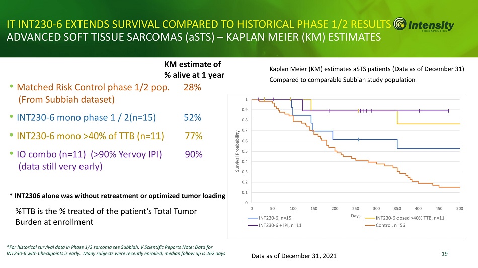 18 POTENTIAL TREATMENT OF SOFT TISSUE SARCOMA (STS) HIGH UNMET MEDICAL NEED – SIGNIFICANT MARKET POTENTIAL 26 metastatic sarcoma subjects treated as of December 31, 2021 • Soft tissue sarcomas cancer is from fat, muscle, nerves • US: 12,000 new cases per year; more than 157,000 total cases • Toxic, anthracycline drugs are 1 st treatment • Sarcoma’ survival prognosis is quite poor: *median overall survival ( mOS) in P1/2 trials * mOS of 2 nd /3 rd line therapy is 11 to 15 months Demographic Value Median prior therapies in INTS P1/2 study 3 (2 to 10) ~75% had 1 or more risk factors Study Jones Cassier Subbiah Median OS 7.6 months CI (4.8 - 10.4) 9.1 months CI (6.3 - 11.8) 9.6 months (CI (8.1 - 14.2) Overall Sarcoma Survival Based on Number of Risk Factors (Subbiah data) 2 or 3 risks 1 risk 0 risk factors mOS Jones Cancer Chemother Pharmacol (2011) 68:423 – 429, Cassier et. al., Annals of Oncology 25: 1222 – 1228, 2014 Subbiah et. al., Scientific Reports | 6:35448 2016