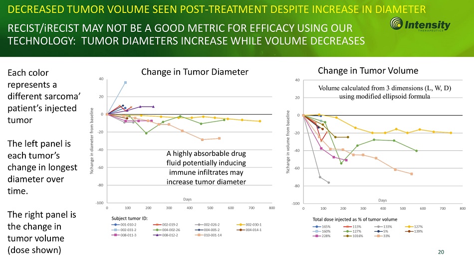 19 • Matched Risk Control phase 1/2 pop. 28% (From Subbiah dataset) • INT230 - 6 mono phase 1 / 2(n=15) 52% • INT230 - 6 mono >40% of TTB (n=11) 77% • IO combo (n=11) (>90% Yervoy IPI) 90% (data still very early) * INT2306 alone was without retreatment or optimized tumor loading IT INT230 - 6 EXTENDS SURVIVAL COMPARED TO HISTORICAL PHASE 1/2 RESUL ADVANCED SOFT TISSUE SARCOMAS (aSTS) – KAPLAN MEIER (KM) ESTIMATES *For historical survival data in Phase 1/2 sarcoma see Subbiah, V Scientific Reports Note: Data for INT230 - 6 with Checkpoints is early. Many subjects were recently enrolled; median follow up is 262 days Data as of December 31, 2021 %TTB is the % treated of the patient’s Total Tumor Burden at enrollment KM estimate of % alive at 1 year Kaplan Meier (KM) estimates aSTS patients (Data as of December 31) Compared to comparable Subbiah study population 1 0.9 0.8 0.7 0.6 0.5 0.4 0.3 0.2 0.1 0 0 150 200 500 Survival Proabability 250 Days 50 100 INT230 - 6, n=15 INT230 - 6 + IPI, n=11 300 350 400 450 INT230 - 6 dosed >40% TTB, n=11 Control, n=56