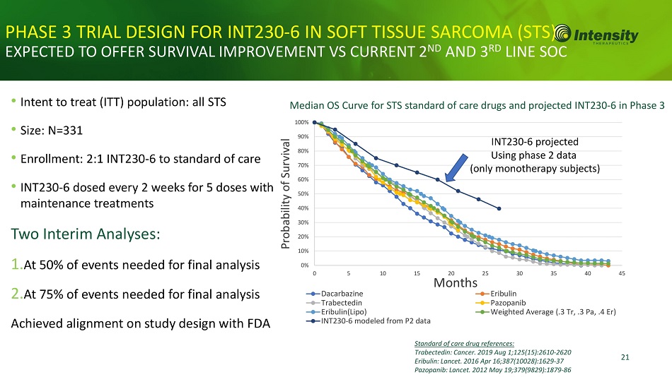 21 PHASE 3 TRIAL DESIGN FOR INT230 - 6 IN SOFT TISSUE SARCOMA (S S) EXPECTED TO OFFER SURVIVAL IMPROVEMENT VS CURRENT 2 ND AND 3 RD LINE SOC Median OS Curve for STS standard of care drugs and projected INT230 - 6 in Phase 3 • Intent to treat (ITT) population: all STS • Size: N=331 • Enrollment: 2:1 INT230 - 6 to standard of care • INT230 - 6 dosed every 2 weeks for 5 doses with maintenance treatments Two Interim Analyses: 1. At 50% of events needed for final analysis 2. At 75% of events needed for final analysis Achieved alignment on study design with FDA Standard of care drug references: Trabectedin: Cancer. 2019 Aug 1;125(15):2610 - 2620 Eribulin: Lancet. 2016 Apr 16;387(10028):1629 - 37 Pazopanib: Lancet. 2012 May 19;379(9829):1879 - 86 0% 10% 20% 30% 40% 50% 60% 70% 80% 90% 100% 0 5 10 15 Dacarbazine Trabectedin Eribulin(Lipo) INT 230 - 6 modeled from P 2 data 20 Months 25 30 35 40 Eribulin Pazopanib Weighted Average (.3 Tr, .3 Pa, .4 Er) 45 Probability of Survival INT230 - 6 projected Using phase 2 data (only monotherapy subjects)