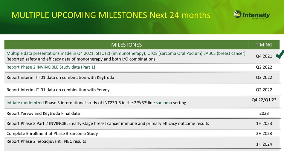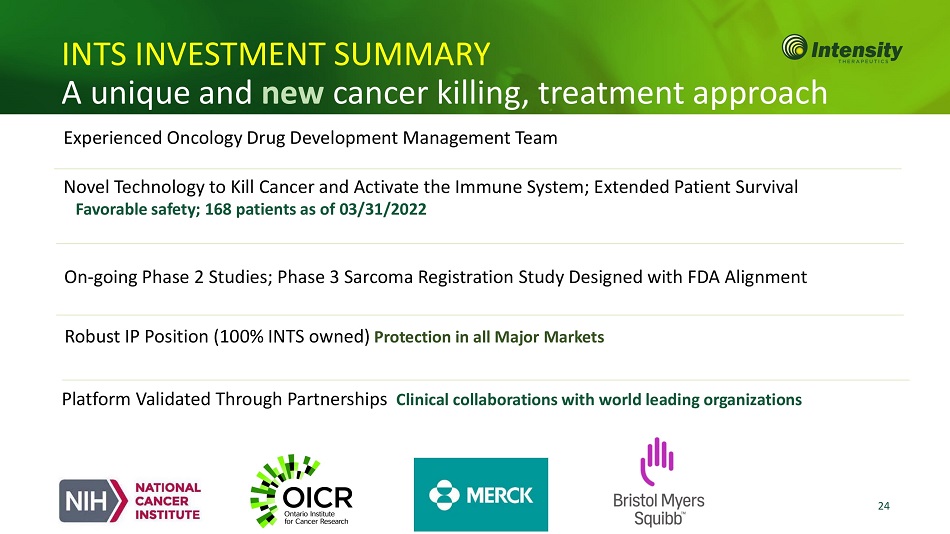 23 MULTIPLE UPCOMING MILESTONES Next 24 months MILESTONES TIMING Multiple data presentations made in Q4 2021; SITC (2) (immunotherapy), CTOS (sarcoma Oral Podium) SABCS (breast cancer) Reported safety and efficacy data of monotherapy and both I/O combinations Q4 2021 Report Phase 2 INVINCIBLE Study data (Part 1) Q2 2022 Report interim IT - 01 data on combination with Keytruda Q2 2022 Report interim IT - 01 data on combination with Yervoy Q2 2022 Initiate randomized Phase 3 international study of INT230 - 6 in the 2 nd /3 rd line sarcoma setting Q4‘22/Q1’23 Report Yervoy and Keytruda Final data 2023 Report Phase 2 Part 2 INVINCIBLE early - stage breast cancer immune and primary efficacy outcome results 1H 2023 Complete Enrollment of Phase 3 Sarcoma Study 2H 2023 Report Phase 2 neoadjuvant TNBC results 1H 2024