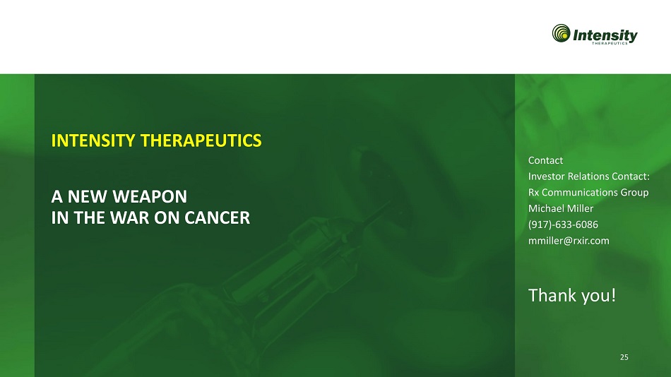25 INTENSITY THERAPEUTICS A NEW WEAPON IN THE WAR ON CANCER Contact Investor Relations Contact : Rx Communications Group Michael Miller (917) - 633 - 6086 mmiller@rxir.com Thank you!