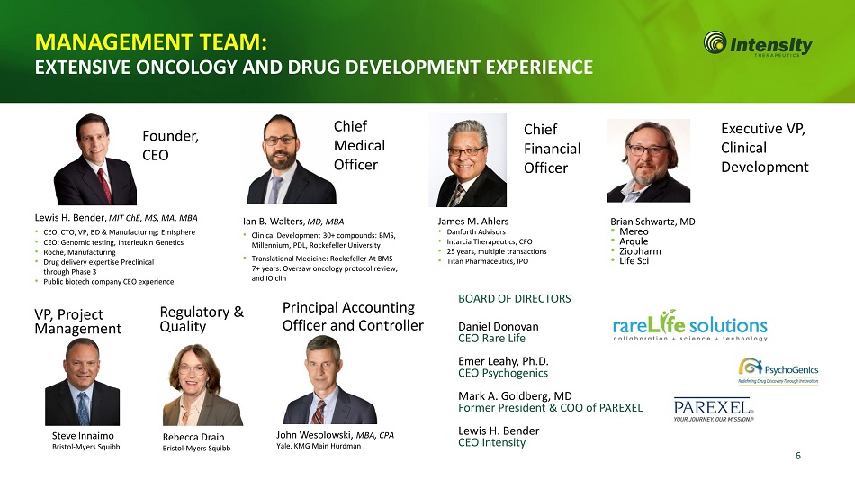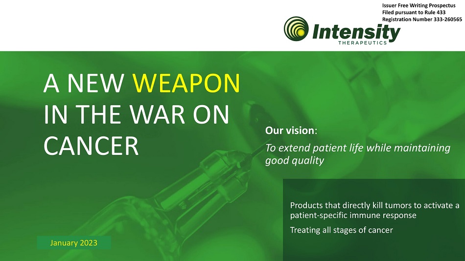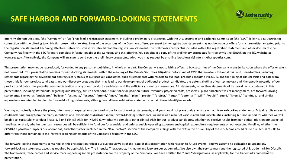 Intensity Therapeutics, Inc. (the “Company” or “we”) has filed a registration statement, including a preliminary prospectus, with the U.S. Securities and Exchange Commission (the “SEC”) (File No. 333 - 260565) in connection with the offering to which this presentation relates. Sales of the securities of the Company offered pursuant to the registration statement may not be made or offers for such securities accepted prior to the registration statement becoming effective. Before you invest, you should read the registration statement, the preliminary prospectus included within the registration statement and other documents the Company has filed with the SEC for more complete information about the Company and this offering. You can obtain a copy of the preliminary prospectus for free by visiting EDGAR on the SEC website at www.sec.gov. Alternatively, the Company will arrange to send you the preliminary prospectus, which you may request by emailing jwesolowski@intensitytherapeutics.com. This presentation may not be reproduced, forwarded to any person or published, in whole or in part. The Company is not soliciting offers to buy securities of the Company in any jurisdiction where the offer or sale is not permitted. This presentation contains forward - looking statements within the meaning of The Private Securities Litigation Reform Act of 1995 that involve substantial risks and uncertainties, including statements regarding the development and regulatory status of our product candidates, such as statements with respect to our lead product candidate INT230 - 6, and the timing of clinical trials and data from those trials for our product candidates, and our discovery programs that may lead to our development of additional product candidates, the potential utility of our technology and therapeutic potential of our product candidates, the potential commercialization of any of our product candidates, and the sufficiency of our cash resources. All statements, other than statements of historical facts, contained in this presentation, including statements regarding our strategy, future operations, future financial position, future revenues, projected costs, prospects, plans and objectives of management, are forward - looking statements. The words “anticipate,” “believe,” “estimate,” “expect,” “intend,” “may,” “might,” “plan,” “predict,” “project,” “target,” “potential,” “will,” “would,” “could,” “should,” “continue,” and similar expressions are intended to identify forward - looking statements, although not all forward - looking statements contain these identifying words. We may not actually achieve the plans, intentions or expectations disclosed in our forward - looking statements, and you should not place undue reliance on our forward - looking statements. Actual results or events could differ materially from the plans, intentions and expectations disclosed in the forward - looking statements we make as a result of various risks and uncertainties, including but not limited to: whether we will be able to successfully conduct Phase 1, 2 or 3 clinical trials for INT230 - 6, whether we complete other clinical trials for our product candidates, whether we receive results from our clinical trials on our expected timelines, or at all, whether our cash resources will be sufficient to fund our foreseeable and unforeseeable operating expenses and capital expenditure requirements on our expected timeline, whether the COVID - 19 pandemic impacts our operations, and other factors included in the “Risk Factors” section of the Company’s filings with the SEC in the future. Any of these outcomes could cause our actual results to differ from those contained in the forward - looking statements of the Company’s filings with the SEC. The forward - looking statements contained in this presentation reflect our current views as of the date of this presentation with respect to future events, and we assume no obligation to update any forward - looking statements except as required by applicable law. The Intensity Therapeutics, Inc. name and logo are our trademarks. We also own the service mark and the registered U.S. trademark for DfuseRx. The trademarks, trade names and service marks appearing in this presentation are the property of the Company. We have omitted the ® and Ρ designations, as applicable, for the trademarks named in 2 this presentation. SAFE HARBOR AND FORWARD - LOOKING STATEMENTS