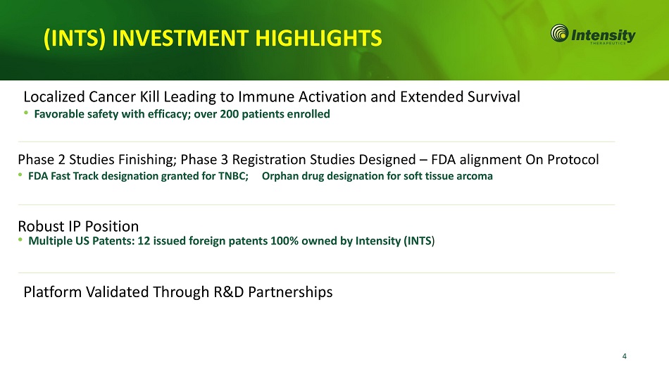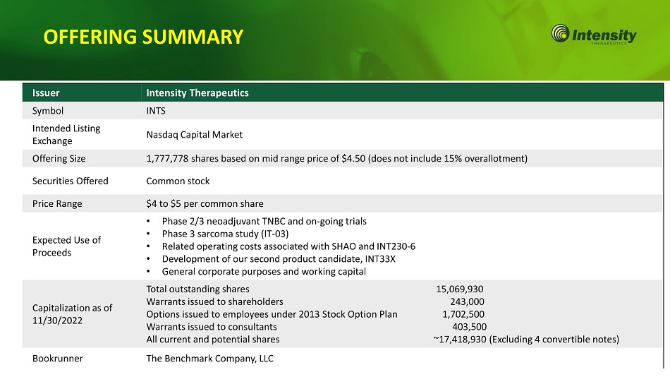 3 Issuer Intensity Therapeutics Symbol INTS Intended Listing Exchange Nasdaq Capital Market Offering Size 1,777,778 shares based on mid range price of $4.50 (does not include 15% overallotment) Securities Offered Common stock Price Range $4 to $5 per common share Expected Use of Proceeds • Phase 2/3 neoadjuvant TNBC and on - going trials • Phase 3 sarcoma study (IT - 03) • Related operating costs associated with SHAO and INT230 - 6 • Development of our second product candidate, INT33X • General corporate purposes and working capital Capi t ali z a tion as of 11/30/2022 Total outstanding shares 15 , 069 , 930 Warrants issued to shareholders 243 , 000 Options issued to employees under 2013 Stock Option Plan 1 , 702 , 500 W ar r a n ts issu e d t o c onsul t a n ts 403 , 500 All current and potential shares ~ 17 , 418 , 930 (Excluding 4 convertible notes) Bookrunner The Benchmark Company, LLC Co - manager: Joseph Gunnar & Co., LLC OFFERING SUMMARY