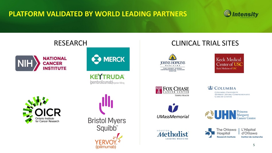 4 (INTS) INVESTMENT HIGHLIGHTS Localized Cancer Kill Leading to Immune Activation and Extended Survival • Favorable safety with efficacy; over 200 patients enrolled Phase 2 Studies Finishing; Phase 3 Registration Studies Designed – FDA alignment On Protocol • FDA Fast Track designation granted for TNBC; Orphan drug designation for soft tissue arcoma Robust IP Position • Multiple US Patents: 12 issued foreign patents 100% owned by Intensity (INTS ) Platform Validated Through R&D Partnerships