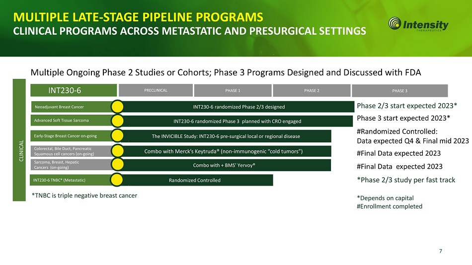 6 MANAGEMENT TEAM: EXTENSIVE ONCOLOGY AND DRUG DEVELOPMENT EXPERIENCE Lewis H. Bender , MIT ChE, MS, MA, MBA • CEO, CTO, VP, BD & Manufacturing: Emisphere • CEO: Genomic testing, Interleukin Genetics • Roche, Manufacturing • Drug delivery expertise Preclinical through Phase 3 • Public biotech company CEO experience Ian B. Walters , MD, MBA • Clinical Development 30+ compounds: BMS, Millennium, PDL, Rockefeller University • Translational Medicine: Rockefeller At BMS 7+ years: Oversaw oncology protocol review, and IO clin James M. Ahlers • Danforth Advisors • Intarcia Therapeutics, CFO • 25 years, multiple transactions • Titan Pharmaceutics, IPO Steve Innaimo Bristol - Myers Squibb Rebecca Drain Bristol - Myers Squibb John Wesolowski, MBA, CPA Yale, KMG Main Hurdman BOARD OF DIRECTORS Declan Doogan, Ph.D. Former VP Development Pfizer Emer Leahy, Ph.D. CEO Psychogenics Mark A. Goldberg, MD Former President & COO of PAREXEL Lewis H. Bender CEO Intensity F o unde r , CEO Chief M ed i c al Officer Principal Accounting Officer and Controller Chief F i nan ci al Officer Regulatory & Quality VP, Project M ana g eme n t Executive VP, Clinical D ev e l o pme nt Brian Schwartz, MD • M e r eo • Arqule • Zio ph arm • L i f e S c i