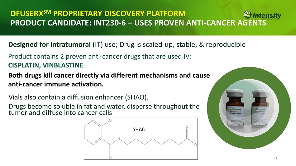 7 Neoadjuvant Breast Cancer INT230 - 6 randomized Phase 2/3 designed INT230 - 6 PRECLINICAL PHASE 1 PHASE 2 PHASE 3 Colorectal, Bile Duct, Pancreatic Squamous cell cancers (on - going) Sarcoma, Breast, Hepatic Cancers (on - going) Combo with + BMS’ Yervoy® Combo with Merck’s Keytruda® (non - immunogenic “cold tumors”) MULTIPLE LATE - STAGE PIPELINE PROGRAMS CLINICAL PROGRAMS ACROSS METASTATIC AND PRESURGICAL SETTINGS Multiple Ongoing Phase 2 Studies or Cohorts; Phase 3 Programs Designed and Discussed with FDA The INVICIBLE Study: INT230 - 6 pre - surgical local or regional disease INT230 - 6 randomized Phase 3 planned with CRO engaged Early - Stage Breast Cancer on - going CLI N IC AL Phase 2/3 start expected 2023* Phase 3 start expected 2023* #Randomized Controlled: Data expected Q4 & Final mid 2023 #Final Data expected 2023 #Final Data expected 2023 *Phase 2/3 study per fast track *Depends on capital #Enrollment completed *TNBC is triple negative breast cancer R and om iz ed C o n t r o ll ed I N T 230 - 6 T N BC* ( Met a st a ti c) Advanced Soft Tissue Sarcoma