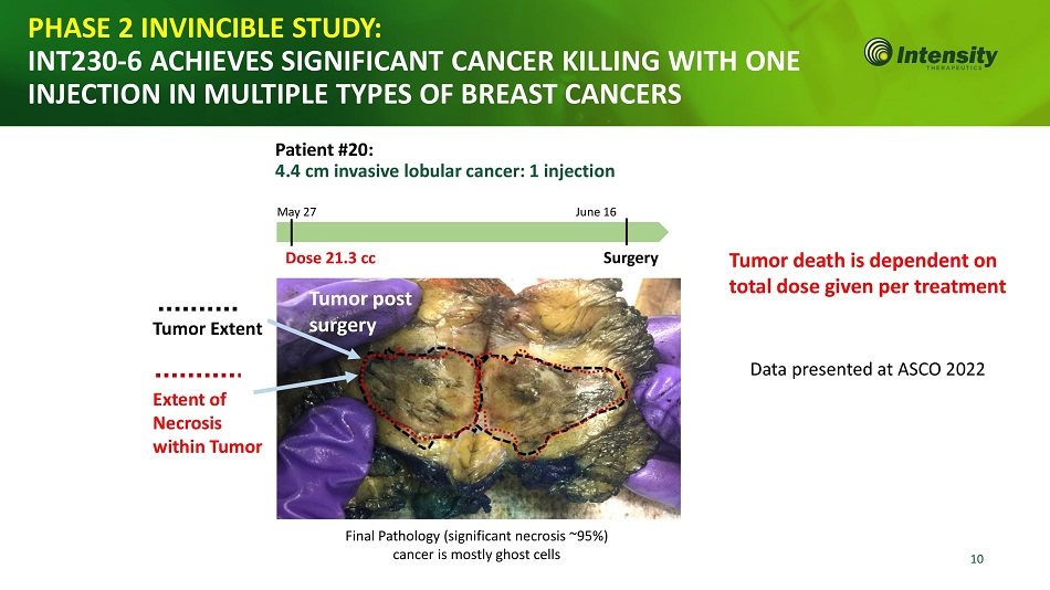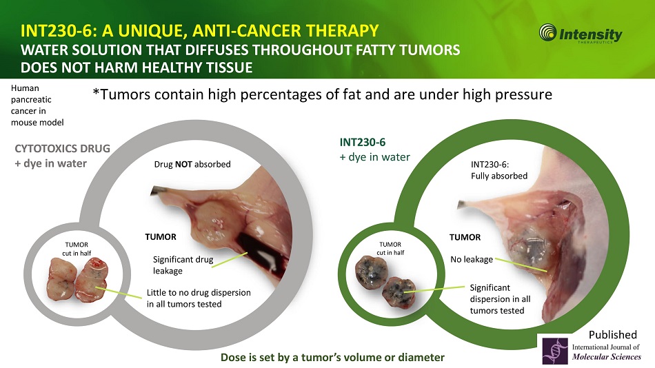 9 INT230 - 6: A UNIQUE, ANTI - CANCER THERAPY WATER SOLUTION THAT DIFFUSES THROUGHOUT FATTY TUMORS DOES NOT HARM HEALTHY TISSUE *Tumors contain high percentages of fat and are under high pressure CYTOTOXICS DRUG + dye in water Little to no drug dispersion in all tumors tested TUMOR cut in half Significant drug leakage Drug NOT absorbed Human pancreatic cancer in mouse model TUMOR cut in half Significant dispersion in all tumors tested No leakage INT230 - 6: Fully absorbed INT230 - 6 + dye in water Dose is set by a tumor’s volume or diameter T UMO R T UMO R Published