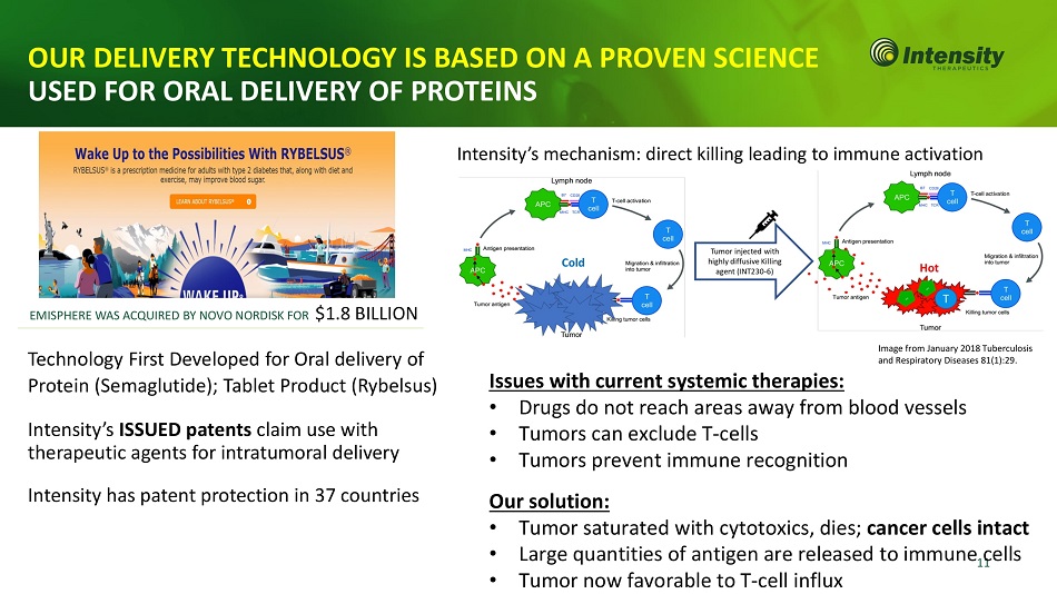 OUR DELIVERY TECHNOLOGY IS BASED ON A PROVEN SCIENCE USED FOR ORAL DELIVERY OF PROTEINS Technology First Developed for Oral delivery of Protein (Semaglutide); Tablet Product (Rybelsus) Intensity’s ISSUED patents claim use with therapeutic agents for intratumoral delivery Intensity has patent protection in 37 countries EMISPHERE WAS ACQUIRED BY NOVO NORDISK FOR $1.8 BILLION Issues with current systemic therapies: • Drugs do not reach areas away from blood vessels • Tumors can exclude T - cells • Tumors prevent immune recognition Our solution: • Tumor saturated with cytotoxics, dies; cancer cells intact • Large quantities of antigen are released to immune 1 c 1 ells • Tumor now favorable to T - cell influx Image from January 2018 Tuberculosis and Respiratory Diseases 81(1):29. Intensity’s mechanism: direct killing leading to immune activation