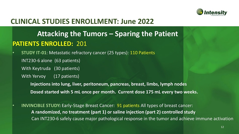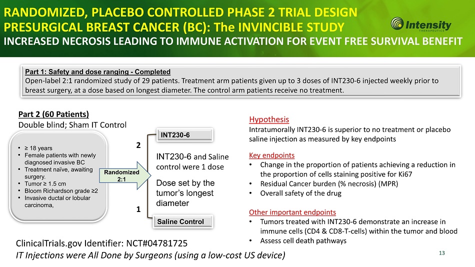 12 CLINICAL STUDIES ENROLLMENT: June 2022 • STUDY IT - 01 : Metastatic refractory cancer (25 types): 110 Patients INT230 - 6 alone (63 patients) With Keytruda (30 patients) With Yervoy (17 patients) Injections into lung, liver, peritoneum, pancreas, breast, limbs, lymph nodes Dosed started with 5 mL once per month. Current dose 175 mL every two weeks. • INVINCIBLE STUDY : Early - Stage Breast Cancer: 91 patients All types of breast cancer: A randomized, no treatment (part 1) or saline injection (part 2) controlled study Can INT230 - 6 safely cause major pathological response in the tumor and achieve immune activation Attacking the Tumors – Sparing the Patient PATIENTS ENROLLED: 201