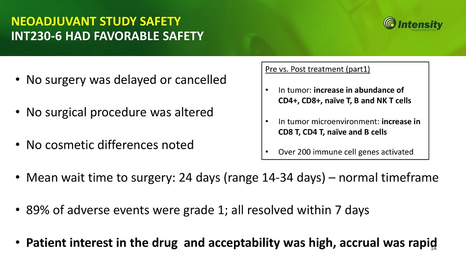 13 • ≥ 18 years • Female patients with newly diagnosed invasive BC • Treatment naïve, awaiting surgery. • Tumor ≥ 1.5 cm • Bloom Richardson grade ≥2 • Invasive ductal or lobular carcinoma, R a ndo mized 2:1 INT230 - 6 Sa li n e Con t r ol Part 1: Safety and dose ranging - Completed Open - label 2:1 randomized study of 29 patients. Treatment arm patients given up to 3 doses of INT230 - 6 injected weekly prior to breast surgery, at a dose based on longest diameter. The control arm patients receive no treatment. ClinicalTrials.gov Identifier: NCT#04781725 IT Injections were All Done by Surgeons (using a low - cost US device) INT230 - 6 and Saline control were 1 dose Dose set by the tumor’s longest diameter Key endpoints • Change in the proportion of patients achieving a reduction in the proportion of cells staining positive for Ki67 • Residual Cancer burden (% necrosis) (MPR) • Overall safety of the drug Other important endpoints • Tumors treated with INT230 - 6 demonstrate an increase in immune cells (CD4 & CD8 - T - cells) within the tumor and blood • Assess cell death pathways RANDOMIZED, PLACEBO CONTROLLED PHASE 2 TRIAL DESIGN PRESURGICAL BREAST CANCER (BC): The INVINCIBLE STUDY INCREASED NECROSIS LEADING TO IMMUNE ACTIVATION FOR EVENT FREE SURVIVAL BENEFIT Part 2 (60 Patients) Double blind; Sham IT Control 2 1 Hypothesis Intratumorally INT230 - 6 is superior to no treatment or placebo saline injection as measured by key endpoints