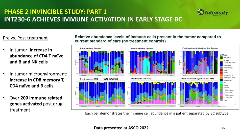14 NEOADJUVANT STUDY SAFETY INT230 - 6 HAD FAVORABLE SAFETY • No surgery was delayed or cancelled • No surgical procedure was altered • No cosmetic differences noted • Mean wait time to surgery: 24 days (range 14 - 34 days) – normal timeframe • 89% of adverse events were grade 1; all resolved within 7 days • Patient interest in the drug and acceptability was high, accrual was rapid Pre vs. Post treatment (part1) • In tumor: increase in abundance of CD4+, CD8+, naïve T, B and NK T cells • In tumor microenvironment: increase in CD8 T, CD4 T, naïve and B cells • Over 200 immune cell genes activated