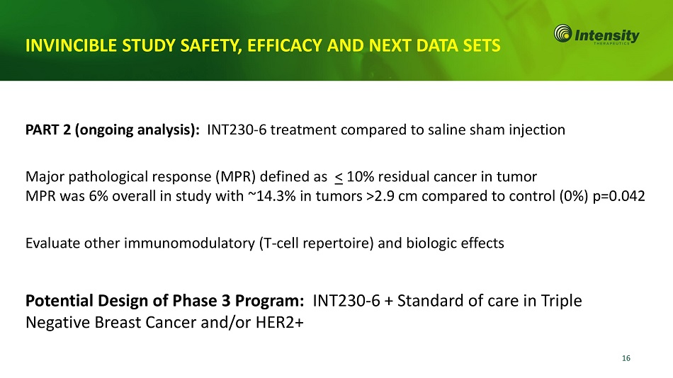 15 PHASE 2 INVINCIBLE STUDY: PART 1 INT230 - 6 ACHIEVES IMMUNE ACTIVATION IN EARLY STAGE BC Relative abundance levels of immune cells present in the tumor compared to current standard of care (no treatment controls) Each bar demonstrates the immune cell abundance in a patient separated by BC subtype. Data presented at ASCO 2022 (Outside tumor) Pre vs. Post treatment • In tumor: increase in abundance of CD4 T naïve and B and NK cells • In tumor microenvironment: increase in CD8 memory T, CD4 naïve and B cells • Over 200 immune related genes activated post drug treatment