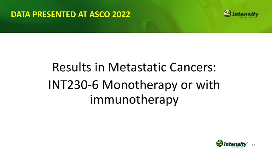 17 DATA PRESENTED AT ASCO 2022 Results in Metastatic Cancers: INT230 - 6 Monotherapy or with immunotherapy