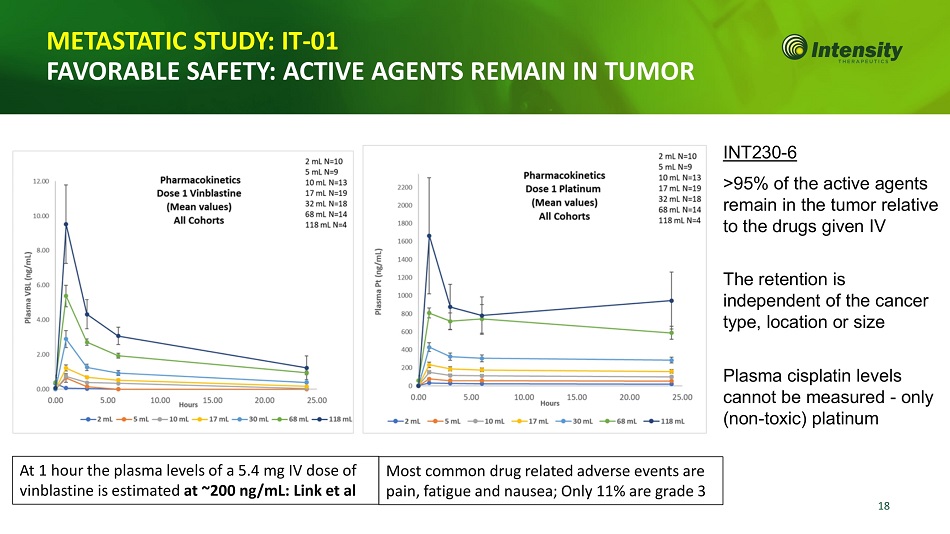 18 METASTATIC STUDY: IT - 01 FAVORABLE SAFETY: ACTIVE AGENTS REMAIN IN TUMOR INT230 - 6 >95% of the active agents remain in the tumor relative to the drugs given IV The retention is independent of the cancer type, location or size Plasma cisplatin levels cannot be measured - only (non - toxic) platinum At 1 hour the plasma levels of a 5.4 mg IV dose of vinblastine is estimated at ~200 ng/mL: Link et al Most common drug related adverse events are pain, fatigue and nausea; Only 11% are grade 3