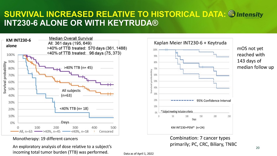 20 All subjects (n=63) >40% TTB (n= 45) <40% TTB (n= 18) KM INT230+PEM* (n=24) KM INT230 - 6 alone mOS not yet reached with 143 days of median follow up Monotherapy: 19 different cancers An exploratory analysis of dose relative to a subject’s incoming total tumor burden (TTB) was performed. Data as of April 1, 2022 SURVIVAL INCREASED RELATIVE TO HISTORICAL DAT INT230 - 6 ALONE OR WITH KEYTRUDA® Kaplan Meier INT230 - 6 + Keytruda Combination: 7 cancer types primarily; PC, CRC, Biliary, TNBC 95% Confidence Interval