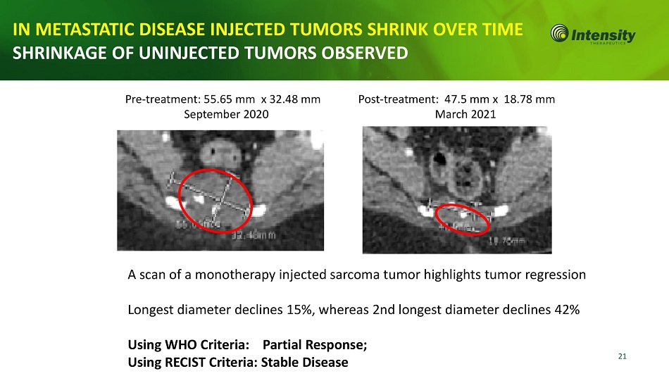 21 IN METASTATIC DISEASE INJECTED TUMORS SHRINK OVER TIME SHRINKAGE OF UNINJECTED TUMORS OBSERVED A scan of a monotherapy injected sarcoma tumor highlights tumor regression Longest diameter declines 15%, whereas 2nd longest diameter declines 42% Using WHO Criteria: Partial Response; Using RECIST Criteria: Stable Disease Pre - treatment: 55.65 mm x 32.48 mm September 2020 Post - treatment: 47.5 mm x 18.78 mm March 2021