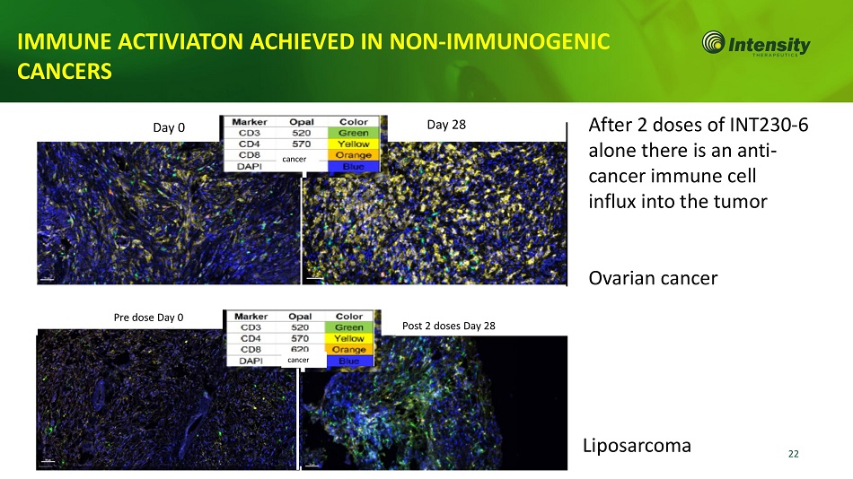 22 Post 2 doses Day 28 Pre dose Day 0 Liposarcoma cancer IMMUNE ACTIVIATON ACHIEVED IN NON - IMMUNOGENIC CANCERS After 2 doses of INT230 - 6 alone there is an anti - cancer immune cell influx into the tumor Ovarian cancer Day 0 Day 28 cancer