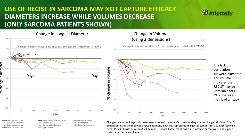 Change in Longest Diameter Change in Volume (using 3 dimensions) The lack of correlation between diameter and volume indicates that RECIST may be unreliable for IT INT230 - 6 as a metric of efficacy Days % change in diameter % change in volume Days Changes in a tumor longest diameter over time and the tumor’s corresponding volume change calculated from 3 dimensions using the modified ellipsoid formula. Each line represents an injected tumor from a subject receiving either INT230 - 6 with or without ipilimumab. Tumors diameters having a size increase or that were stable 2 o 3 ften shown a decrease in volume. USE OF RECIST IN SARCOMA MAY NOT CAPTURE EFFICACY DIAMETERS INCREASE WHILE VOLUMES DECREASE (ONLY SARCOMA PATIENTS SHOWN)
