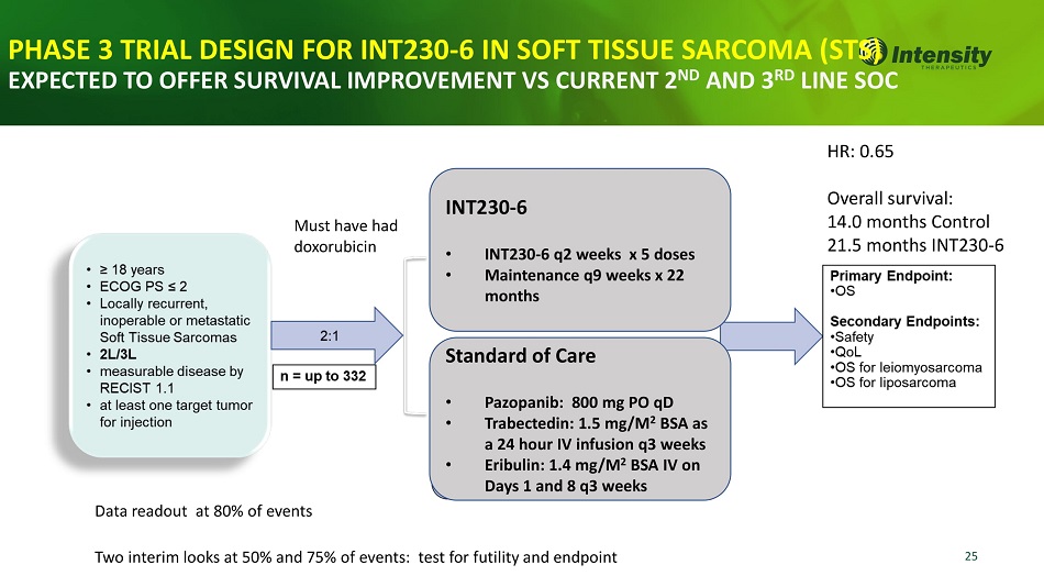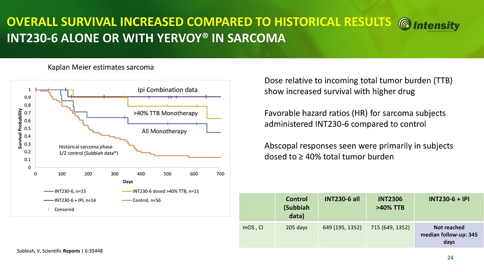 24 1 0 .9 0 .8 0 .7 0 .6 0 .5 0 .4 Survival Probability INT230 - 6 dosed >40% TTB, n=11 Control, n=56 INT230 - 6, n=15 INT230 - 6 + IPI, n=14 Censored 0.3 Historical sarcoma phase 0.2 1/2 control (Subbiah data*) 0.1 0 0 100 200 300 400 500 600 700 Days Kaplan Meier estimates sarcoma Ipi Combination data Control ( S ubbiah data) INT230 - 6 all INT2306 >40% TTB INT230 - 6 + IPI mOS , CI 205 days 649 (195, 1352) 715 (649, 1352) Not reached median follow - up: 345 days Dose relative to incoming total tumor burden (TTB) show increased survival with higher drug Favorable hazard ratios (HR) for sarcoma subjects administered INT230 - 6 compared to control Abscopal responses seen were primarily in subjects dosed to ≥ 40% total tumor burden OVERALL SURVIVAL INCREASED COMPARED TO HISTORICAL RESULT INT230 - 6 ALONE OR WITH YERVOY® IN SARCOMA Subbiah, V, Scientific Reports | 6:35448 >40% TTB Monotherapy All Monotherapy