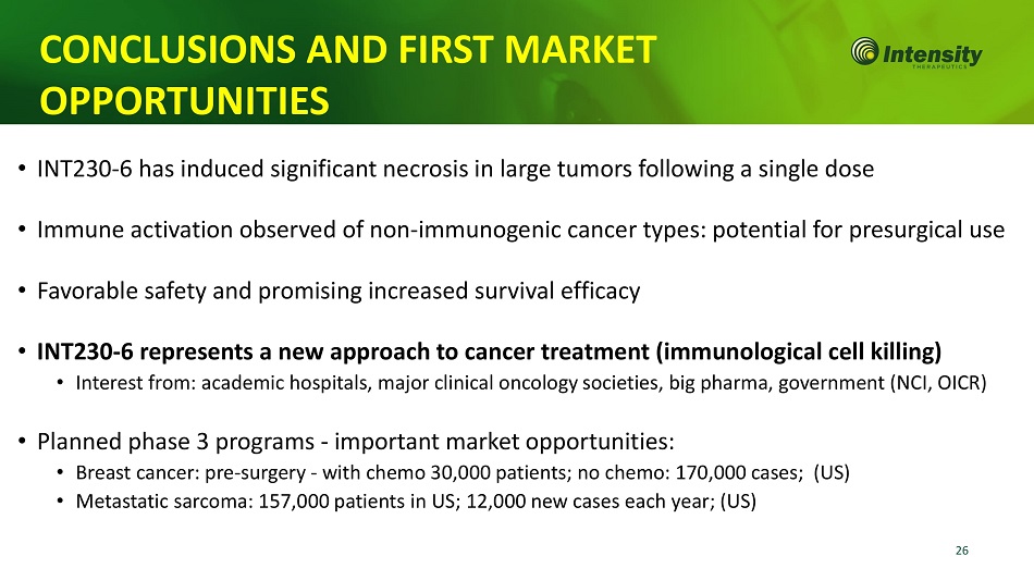 25 Two interim looks at 50% and 75% of events: test for futility and endpoint Must have had doxorubicin HR: 0.65 Overall survival: 14.0 months Control 21.5 months INT230 - 6 Data readout at 80% of events PHASE 3 TRIAL DESIGN FOR INT230 - 6 IN SOFT TISSUE SARCOMA S) EXPECTED TO OFFER SURVIVAL IMPROVEMENT VS CURRENT 2 ND AND 3 RD LINE SOC INT230 - 6 • INT230 - 6 q2 weeks x 5 doses • Maintenance q9 weeks x 22 months Standard of Care • Pazopanib: 800 mg PO qD • Trabectedin: 1.5 mg/M 2 BSA as a 24 hour IV infusion q3 weeks • Eribulin: 1.4 mg/M 2 BSA IV on Days 1 and 8 q3 weeks