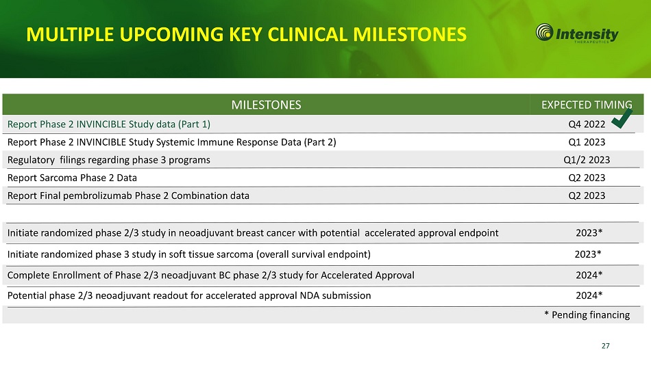 26 • INT230 - 6 has induced significant necrosis in large tumors following a single dose • Immune activation observed of non - immunogenic cancer types: potential for presurgical use • Favorable safety and promising increased survival efficacy • INT230 - 6 represents a new approach to cancer treatment (immunological cell killing) • Interest from: academic hospitals, major clinical oncology societies, big pharma, government (NCI, OICR) • Planned phase 3 programs - important market opportunities: • Breast cancer: pre - surgery - with chemo 30,000 patients; no chemo: 170,000 cases; (US) • Metastatic sarcoma: 157,000 patients in US; 12,000 new cases each year; (US) CONCLUSIONS AND FIRST MARKET OPPORTUNITIES