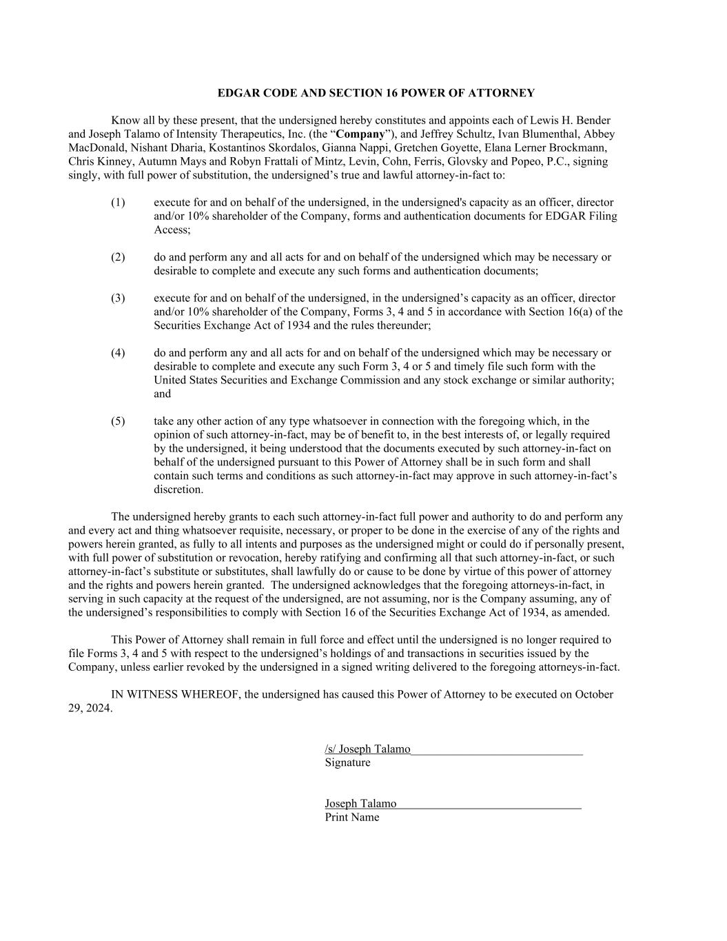 EDGAR CODE AND SECTION 16 POWER OF ATTORNEY Know all by these present, that the undersigned hereby constitutes and appoints each of Lewis H. Bender and Joseph Talamo of Intensity Therapeutics, Inc. (the “Company”), and Jeffrey Schultz, Ivan Blumenthal, Abbey MacDonald, Nishant Dharia, Kostantinos Skordalos, Gianna Nappi, Gretchen Goyette, Elana Lerner Brockmann, Chris Kinney, Autumn Mays and Robyn Frattali of Mintz, Levin, Cohn, Ferris, Glovsky and Popeo, P.C., signing singly, with full power of substitution, the undersigned’s true and lawful attorney-in-fact to: (1) execute for and on behalf of the undersigned, in the undersigned's capacity as an officer, director and/or 10% shareholder of the Company, forms and authentication documents for EDGAR Filing Access; (2) do and perform any and all acts for and on behalf of the undersigned which may be necessary or desirable to complete and execute any such forms and authentication documents; (3) execute for and on behalf of the undersigned, in the undersigned’s capacity as an officer, director and/or 10% shareholder of the Company, Forms 3, 4 and 5 in accordance with Section 16(a) of the Securities Exchange Act of 1934 and the rules thereunder; (4) do and perform any and all acts for and on behalf of the undersigned which may be necessary or desirable to complete and execute any such Form 3, 4 or 5 and timely file such form with the United States Securities and Exchange Commission and any stock exchange or similar authority; and (5) take any other action of any type whatsoever in connection with the foregoing which, in the opinion of such attorney-in-fact, may be of benefit to, in the best interests of, or legally required by the undersigned, it being understood that the documents executed by such attorney-in-fact on behalf of the undersigned pursuant to this Power of Attorney shall be in such form and shall contain such terms and conditions as such attorney-in-fact may approve in such attorney-in-fact’s discretion. The undersigned hereby grants to each such attorney-in-fact full power and authority to do and perform any and every act and thing whatsoever requisite, necessary, or proper to be done in the exercise of any of the rights and powers herein granted, as fully to all intents and purposes as the undersigned might or could do if personally present, with full power of substitution or revocation, hereby ratifying and confirming all that such attorney-in-fact, or such attorney-in-fact’s substitute or substitutes, shall lawfully do or cause to be done by virtue of this power of attorney and the rights and powers herein granted. The undersigned acknowledges that the foregoing attorneys-in-fact, in serving in such capacity at the request of the undersigned, are not assuming, nor is the Company assuming, any of the undersigned’s responsibilities to comply with Section 16 of the Securities Exchange Act of 1934, as amended. This Power of Attorney shall remain in full force and effect until the undersigned is no longer required to file Forms 3, 4 and 5 with respect to the undersigned’s holdings of and transactions in securities issued by the Company, unless earlier revoked by the undersigned in a signed writing delivered to the foregoing attorneys-in-fact. IN WITNESS WHEREOF, the undersigned has caused this Power of Attorney to be executed on October 29, 2024. /s/ Joseph Talamo_____________________________ Signature Joseph Talamo Print Name