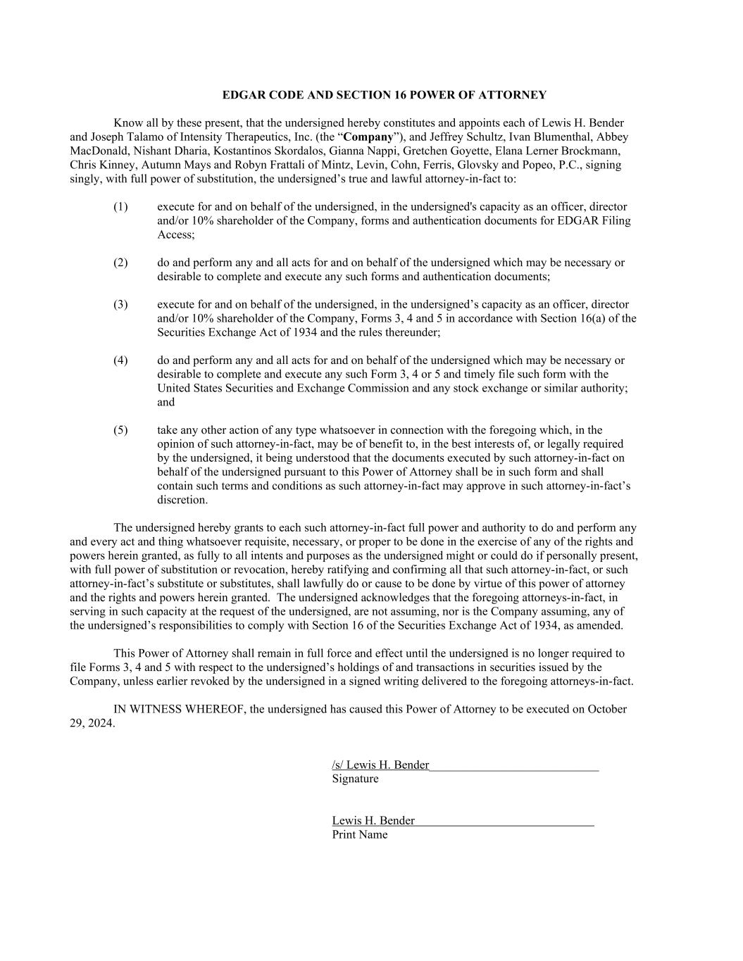 EDGAR CODE AND SECTION 16 POWER OF ATTORNEY Know all by these present, that the undersigned hereby constitutes and appoints each of Lewis H. Bender and Joseph Talamo of Intensity Therapeutics, Inc. (the “Company”), and Jeffrey Schultz, Ivan Blumenthal, Abbey MacDonald, Nishant Dharia, Kostantinos Skordalos, Gianna Nappi, Gretchen Goyette, Elana Lerner Brockmann, Chris Kinney, Autumn Mays and Robyn Frattali of Mintz, Levin, Cohn, Ferris, Glovsky and Popeo, P.C., signing singly, with full power of substitution, the undersigned’s true and lawful attorney-in-fact to: (1) execute for and on behalf of the undersigned, in the undersigned's capacity as an officer, director and/or 10% shareholder of the Company, forms and authentication documents for EDGAR Filing Access; (2) do and perform any and all acts for and on behalf of the undersigned which may be necessary or desirable to complete and execute any such forms and authentication documents; (3) execute for and on behalf of the undersigned, in the undersigned’s capacity as an officer, director and/or 10% shareholder of the Company, Forms 3, 4 and 5 in accordance with Section 16(a) of the Securities Exchange Act of 1934 and the rules thereunder; (4) do and perform any and all acts for and on behalf of the undersigned which may be necessary or desirable to complete and execute any such Form 3, 4 or 5 and timely file such form with the United States Securities and Exchange Commission and any stock exchange or similar authority; and (5) take any other action of any type whatsoever in connection with the foregoing which, in the opinion of such attorney-in-fact, may be of benefit to, in the best interests of, or legally required by the undersigned, it being understood that the documents executed by such attorney-in-fact on behalf of the undersigned pursuant to this Power of Attorney shall be in such form and shall contain such terms and conditions as such attorney-in-fact may approve in such attorney-in-fact’s discretion. The undersigned hereby grants to each such attorney-in-fact full power and authority to do and perform any and every act and thing whatsoever requisite, necessary, or proper to be done in the exercise of any of the rights and powers herein granted, as fully to all intents and purposes as the undersigned might or could do if personally present, with full power of substitution or revocation, hereby ratifying and confirming all that such attorney-in-fact, or such attorney-in-fact’s substitute or substitutes, shall lawfully do or cause to be done by virtue of this power of attorney and the rights and powers herein granted. The undersigned acknowledges that the foregoing attorneys-in-fact, in serving in such capacity at the request of the undersigned, are not assuming, nor is the Company assuming, any of the undersigned’s responsibilities to comply with Section 16 of the Securities Exchange Act of 1934, as amended. This Power of Attorney shall remain in full force and effect until the undersigned is no longer required to file Forms 3, 4 and 5 with respect to the undersigned’s holdings of and transactions in securities issued by the Company, unless earlier revoked by the undersigned in a signed writing delivered to the foregoing attorneys-in-fact. IN WITNESS WHEREOF, the undersigned has caused this Power of Attorney to be executed on October 29, 2024. /s/ Lewis H. Bender____________________________ Signature Lewis H. Bender Print Name
