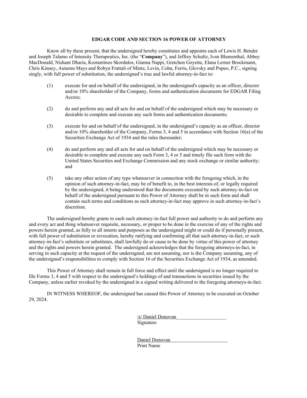 EDGAR CODE AND SECTION 16 POWER OF ATTORNEY Know all by these present, that the undersigned hereby constitutes and appoints each of Lewis H. Bender and Joseph Talamo of Intensity Therapeutics, Inc. (the “Company”), and Jeffrey Schultz, Ivan Blumenthal, Abbey MacDonald, Nishant Dharia, Kostantinos Skordalos, Gianna Nappi, Gretchen Goyette, Elana Lerner Brockmann, Chris Kinney, Autumn Mays and Robyn Frattali of Mintz, Levin, Cohn, Ferris, Glovsky and Popeo, P.C., signing singly, with full power of substitution, the undersigned’s true and lawful attorney-in-fact to: (1) execute for and on behalf of the undersigned, in the undersigned's capacity as an officer, director and/or 10% shareholder of the Company, forms and authentication documents for EDGAR Filing Access; (2) do and perform any and all acts for and on behalf of the undersigned which may be necessary or desirable to complete and execute any such forms and authentication documents; (3) execute for and on behalf of the undersigned, in the undersigned’s capacity as an officer, director and/or 10% shareholder of the Company, Forms 3, 4 and 5 in accordance with Section 16(a) of the Securities Exchange Act of 1934 and the rules thereunder; (4) do and perform any and all acts for and on behalf of the undersigned which may be necessary or desirable to complete and execute any such Form 3, 4 or 5 and timely file such form with the United States Securities and Exchange Commission and any stock exchange or similar authority; and (5) take any other action of any type whatsoever in connection with the foregoing which, in the opinion of such attorney-in-fact, may be of benefit to, in the best interests of, or legally required by the undersigned, it being understood that the documents executed by such attorney-in-fact on behalf of the undersigned pursuant to this Power of Attorney shall be in such form and shall contain such terms and conditions as such attorney-in-fact may approve in such attorney-in-fact’s discretion. The undersigned hereby grants to each such attorney-in-fact full power and authority to do and perform any and every act and thing whatsoever requisite, necessary, or proper to be done in the exercise of any of the rights and powers herein granted, as fully to all intents and purposes as the undersigned might or could do if personally present, with full power of substitution or revocation, hereby ratifying and confirming all that such attorney-in-fact, or such attorney-in-fact’s substitute or substitutes, shall lawfully do or cause to be done by virtue of this power of attorney and the rights and powers herein granted. The undersigned acknowledges that the foregoing attorneys-in-fact, in serving in such capacity at the request of the undersigned, are not assuming, nor is the Company assuming, any of the undersigned’s responsibilities to comply with Section 16 of the Securities Exchange Act of 1934, as amended. This Power of Attorney shall remain in full force and effect until the undersigned is no longer required to file Forms 3, 4 and 5 with respect to the undersigned’s holdings of and transactions in securities issued by the Company, unless earlier revoked by the undersigned in a signed writing delivered to the foregoing attorneys-in-fact. IN WITNESS WHEREOF, the undersigned has caused this Power of Attorney to be executed on October 29, 2024. /s/ Daniel Donovan____________________ Signature Daniel Donovan Print Name